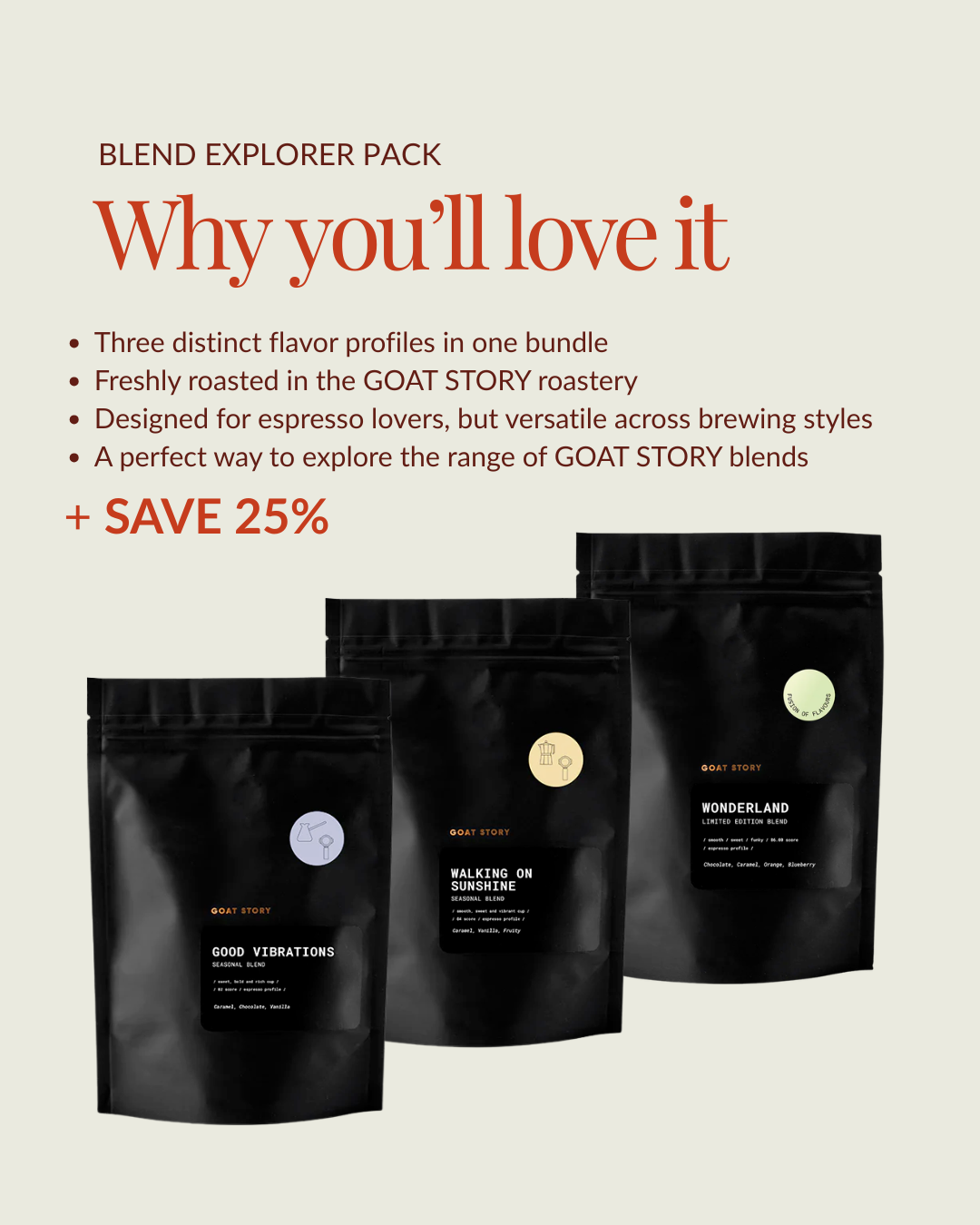 Explore three distinct coffee personalities in one freshly roasted bundle from the GOAT STORY roastery. The Blend Explorer Pack combines: