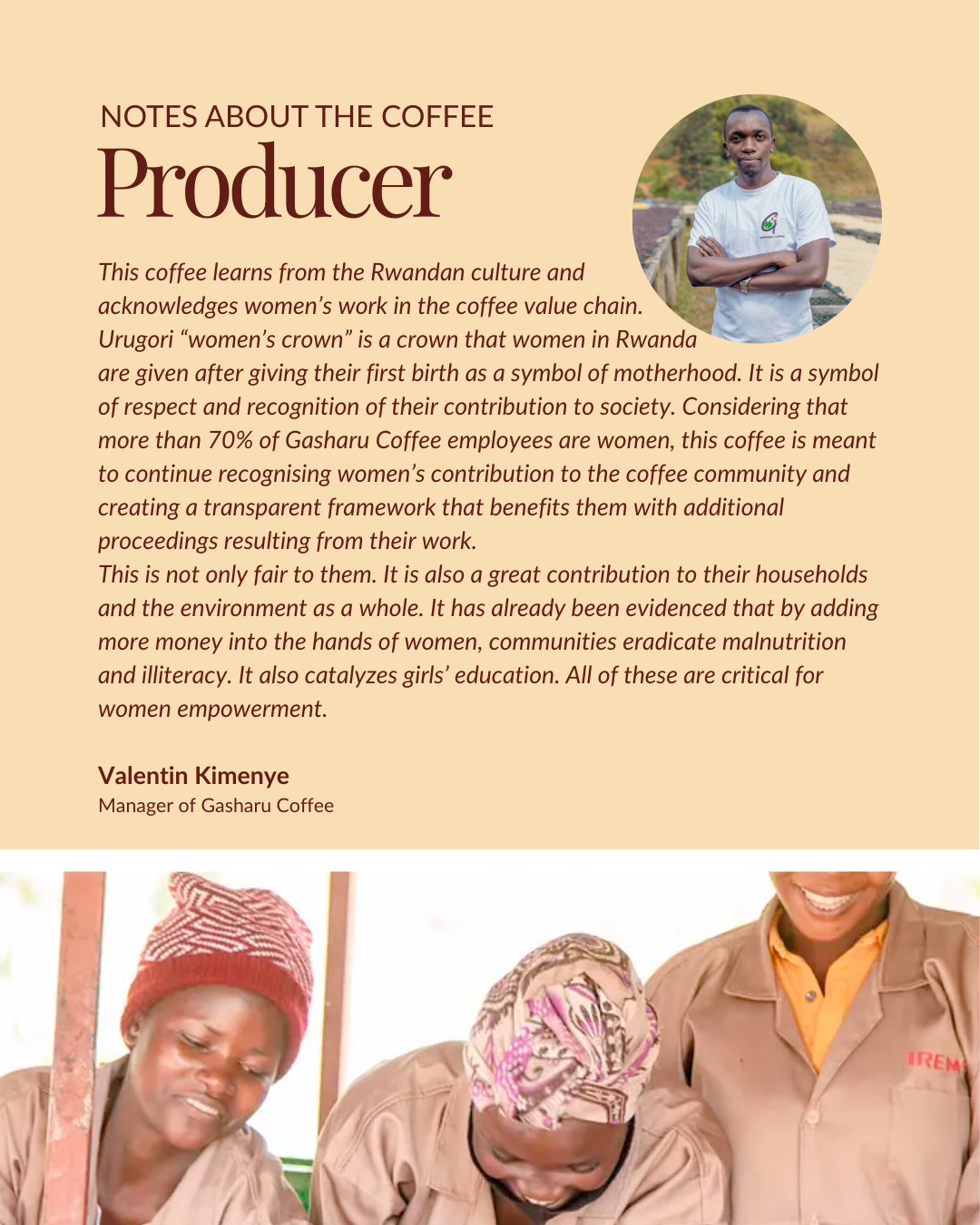 This coffee learns from the Rwandan culture and acknowledges women’s work in the coffee value chain. Urugori “women’s crown” is a crown that women in Rwanda are given after giving their first birth as a symbol of motherhood. It is a symbol of respect and recognition of their contribution to society. Considering that more than 70% of Gasharu Coffee employees are women, this coffee is meant to continue recognising women’s contribution to the coffee community and creating a transparent framework that benefits them with additional proceedings resulting from their work. This is not only fair to them. It is also a great contribution to their households and the environment as a whole. It has already been evidenced that by adding more money into the hands of women, communities eradicate malnutrition and illiteracy. It also catalyzes girls’ education. All of these are critical for women empowerment.