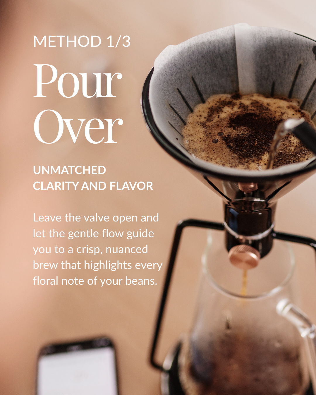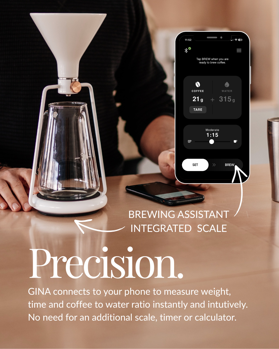 GINA connects to your phone to measure weight, time and coffee to water ratio instantly and intutively. No need for an additional scale, timer or calculator.