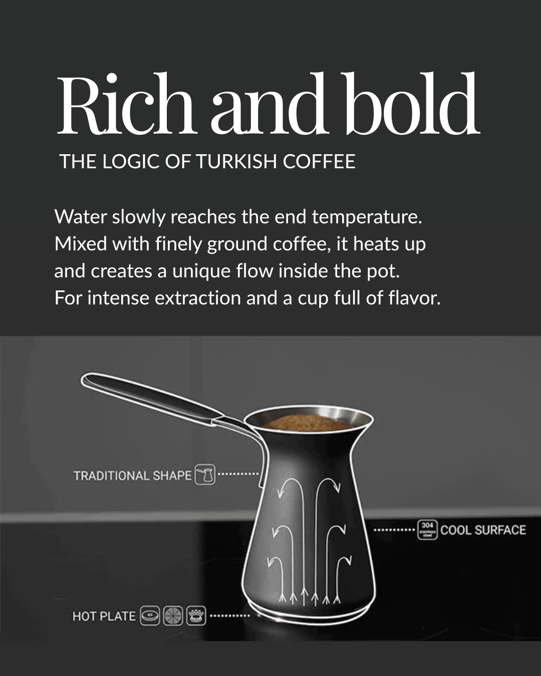 The secret to the rich and bold cup of coffee is water that is slowly reaching the end temperature. Mixed with finely ground coffee, it heats up and creates a unique flow inside the pot. Creating an intense extraction and a cup full of flavor.