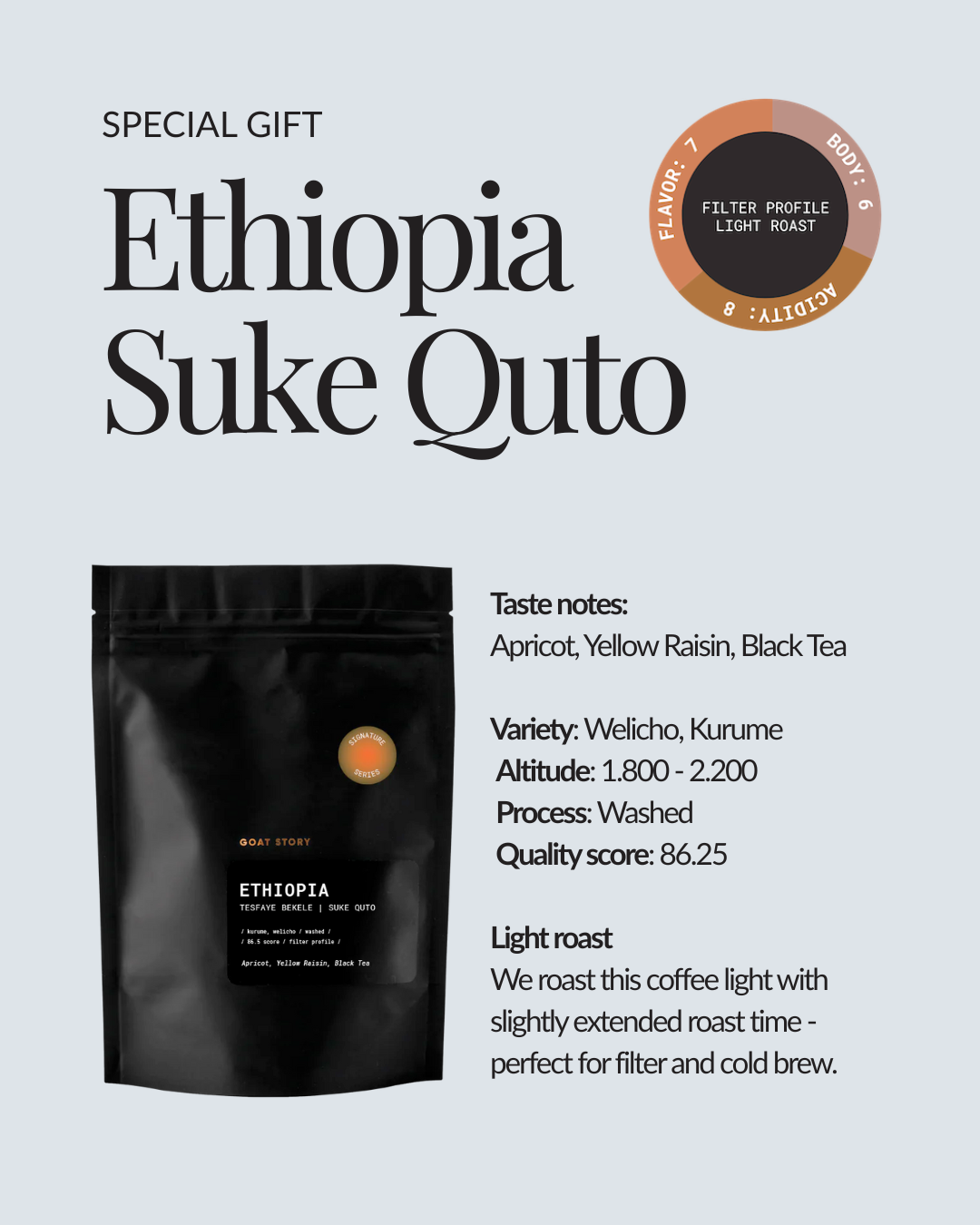 To complete the experience, each bundle includes a special gift: a bag of Ethiopia Suke Quto, freshly roasted in the GOAT STORY roastery.